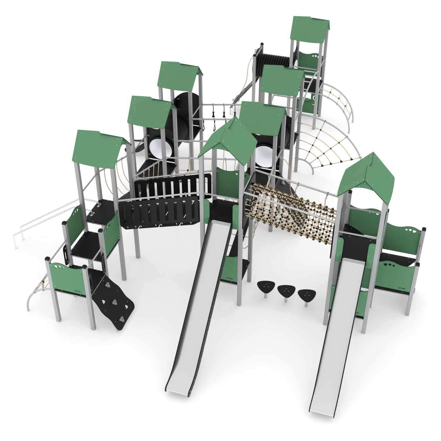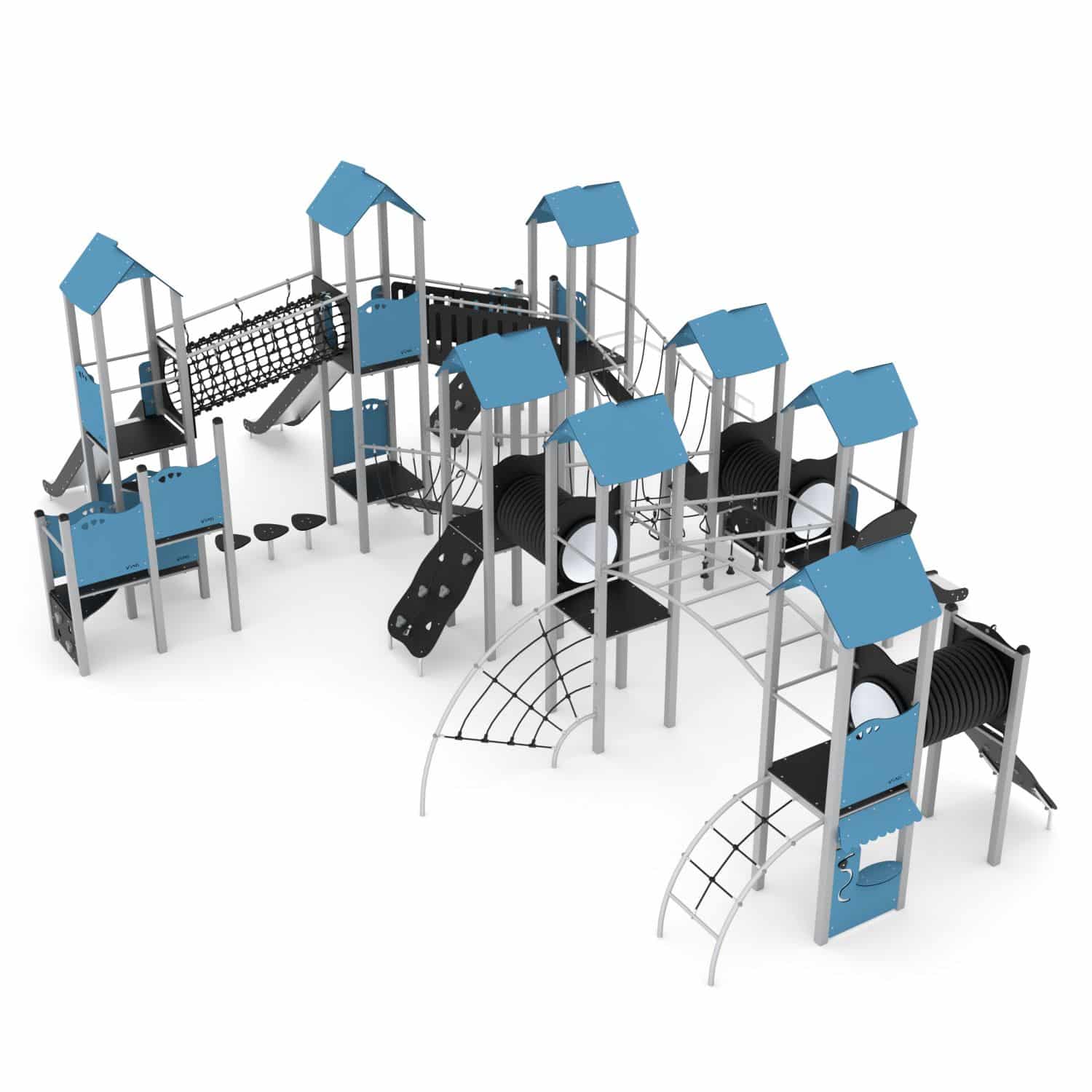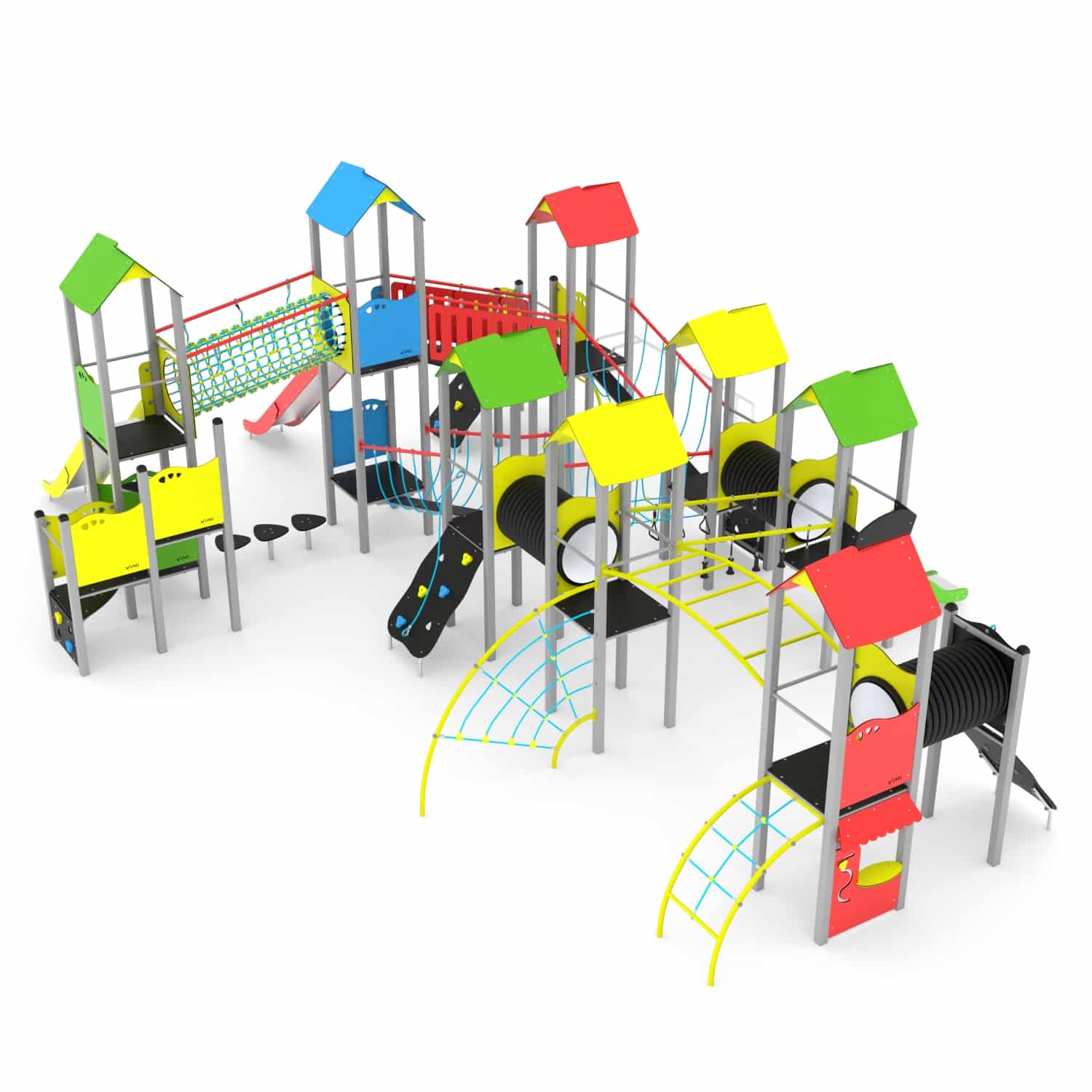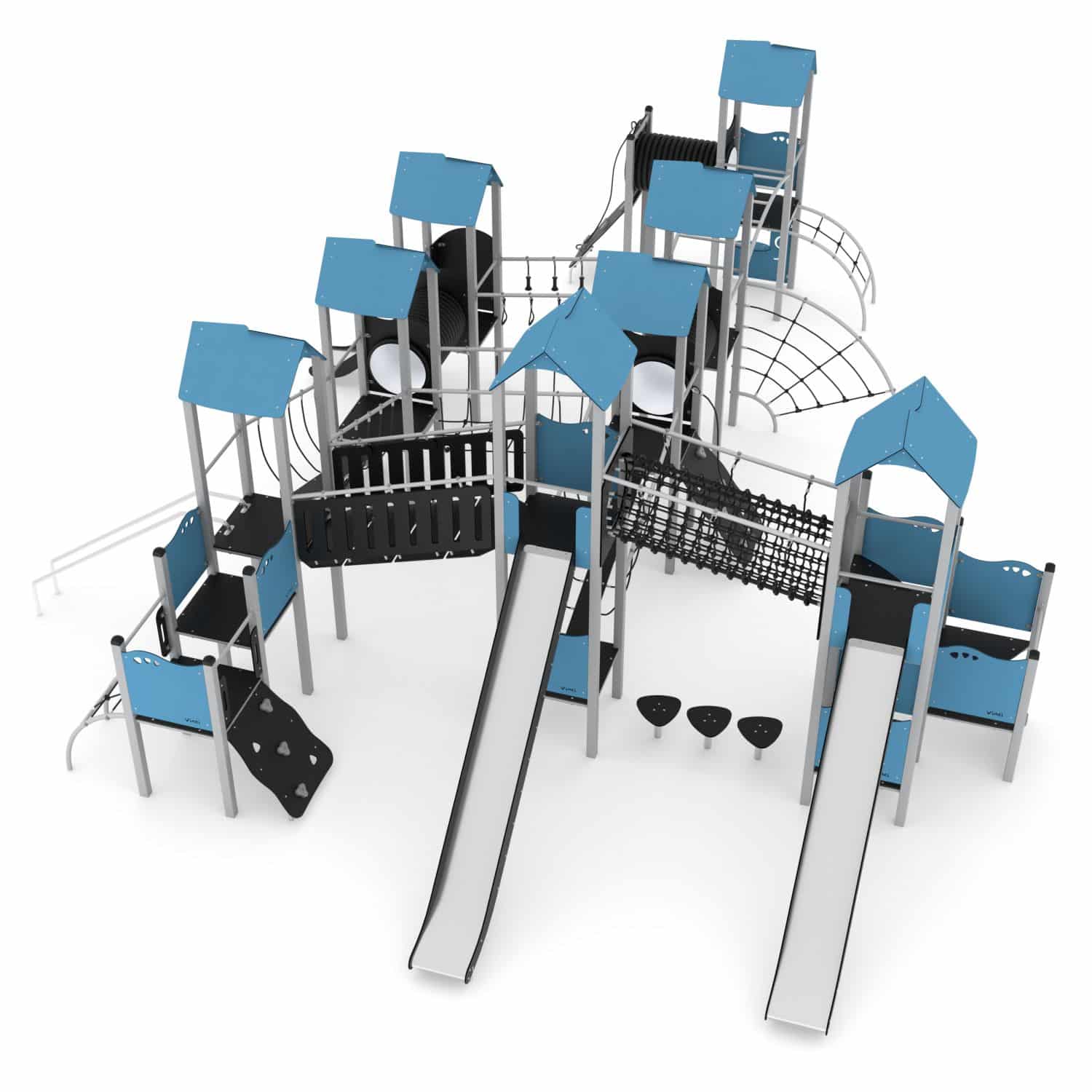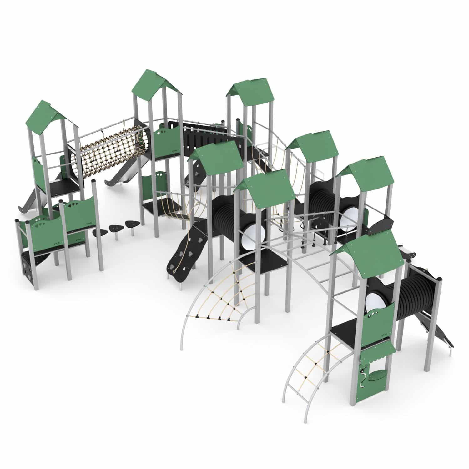 Speelcombinatie XXL met 8 torens, bruggen, klimnetten, kruipbuizen en glijstangen