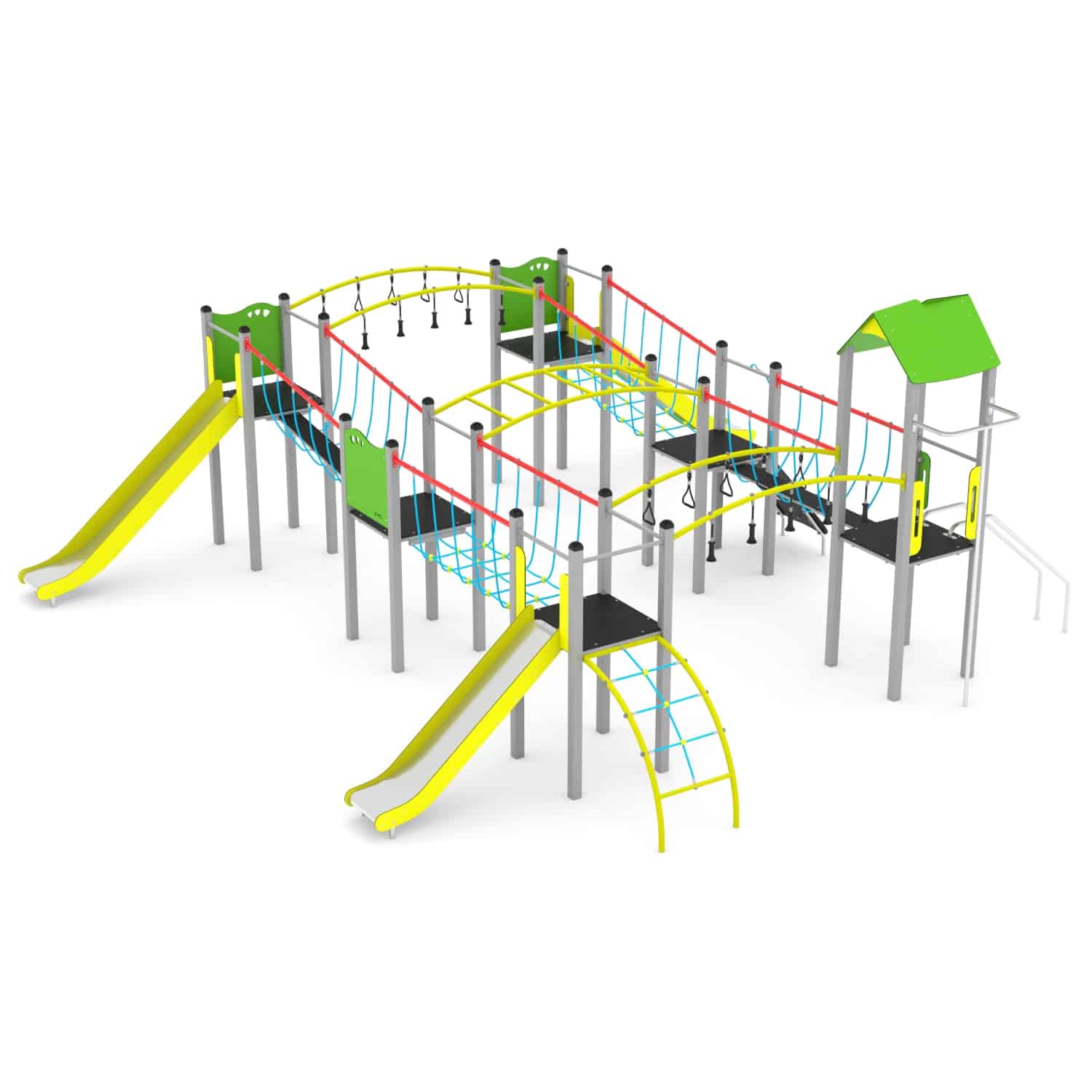 Speelcombinatie met 6 torens, 3 glijbanen, bruggen, brandweerpaal en glijstangen
