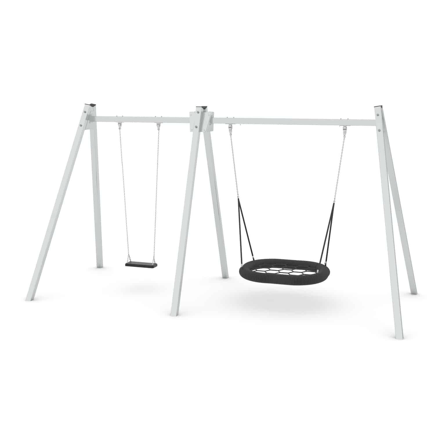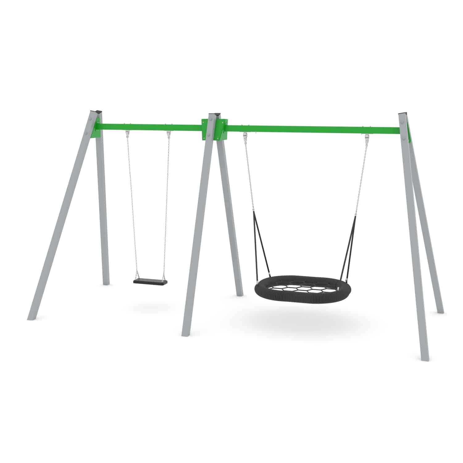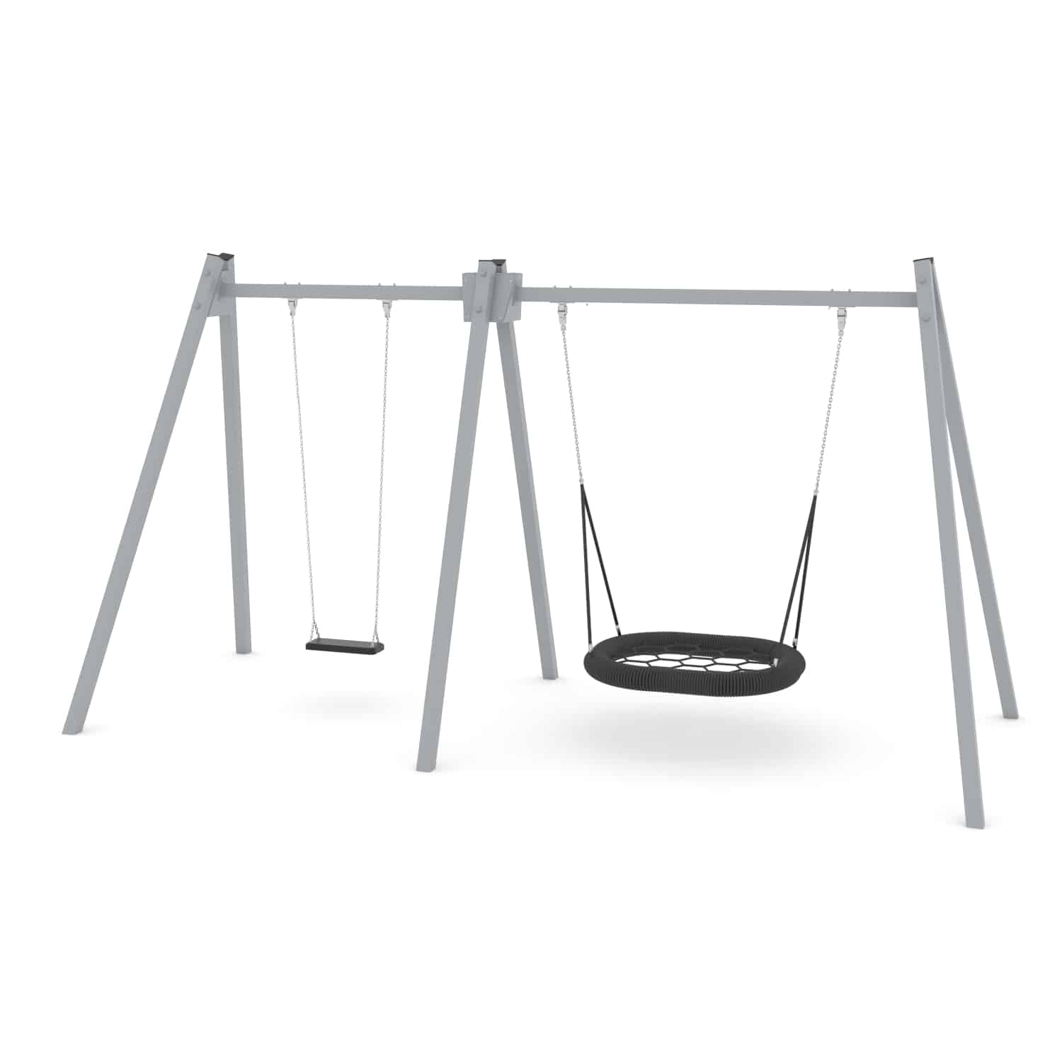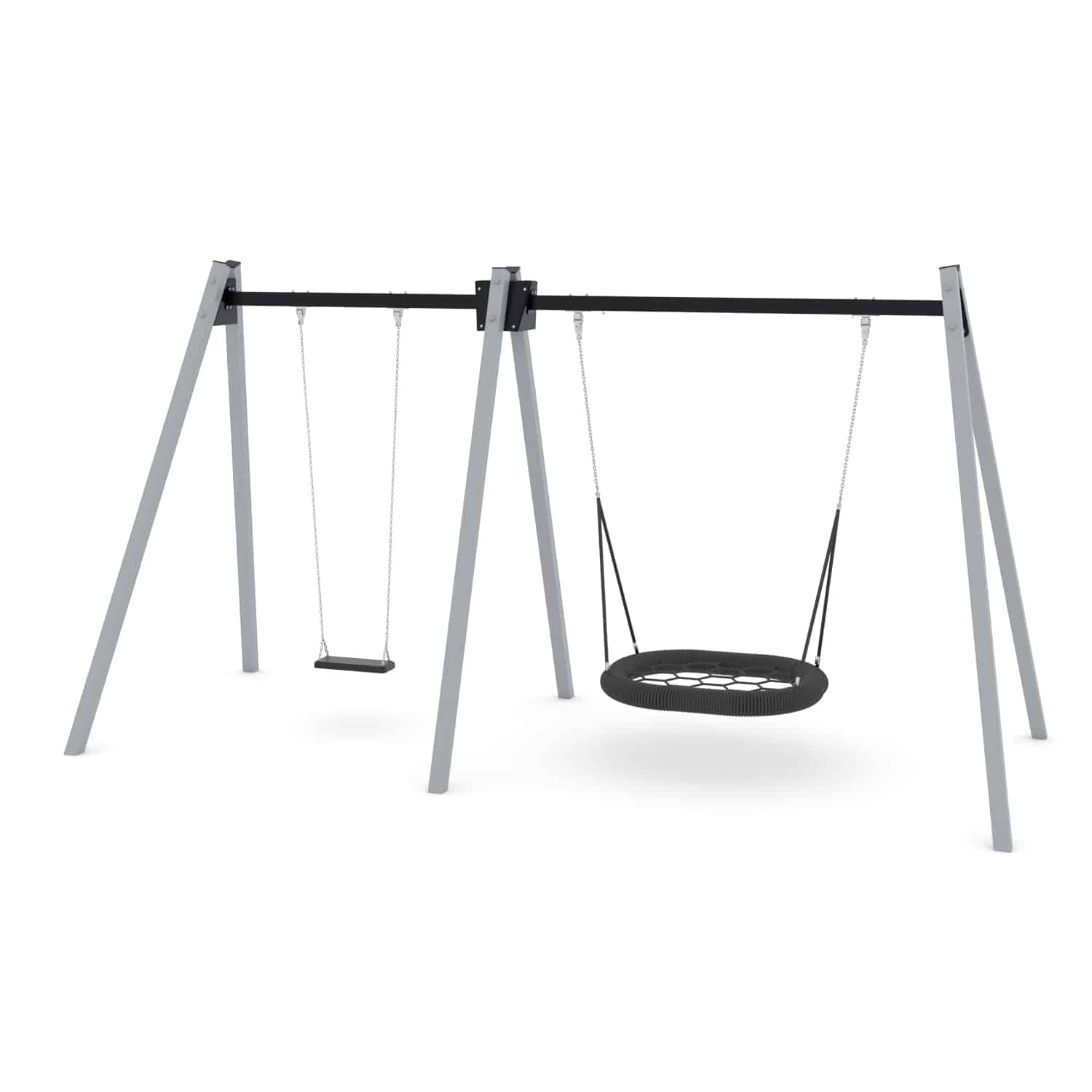 Strak vormgegeven Schommelcombi met een vogelnestschommel en standaard zitje waarbij optioneel voor een ander zitje gekozen kan worden.