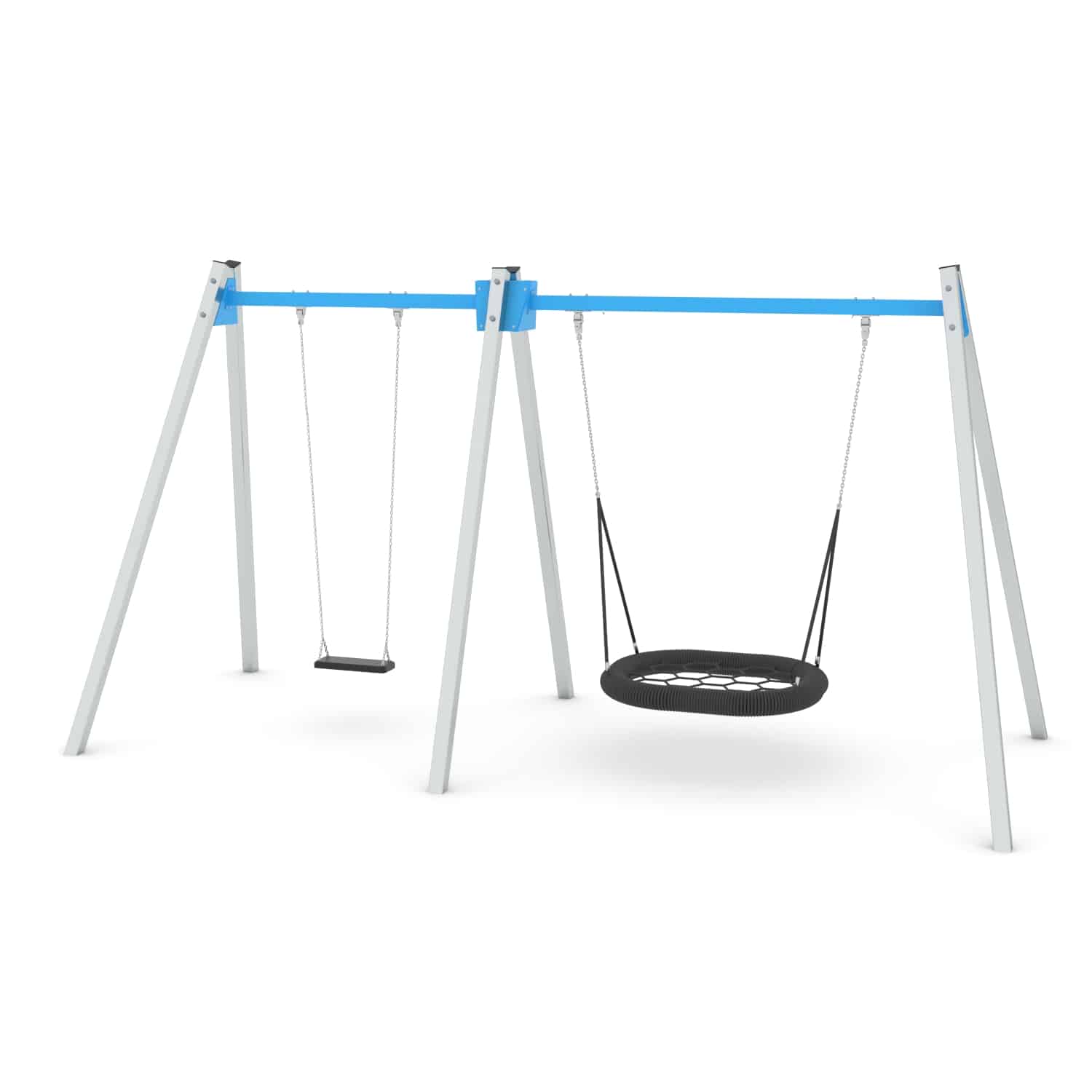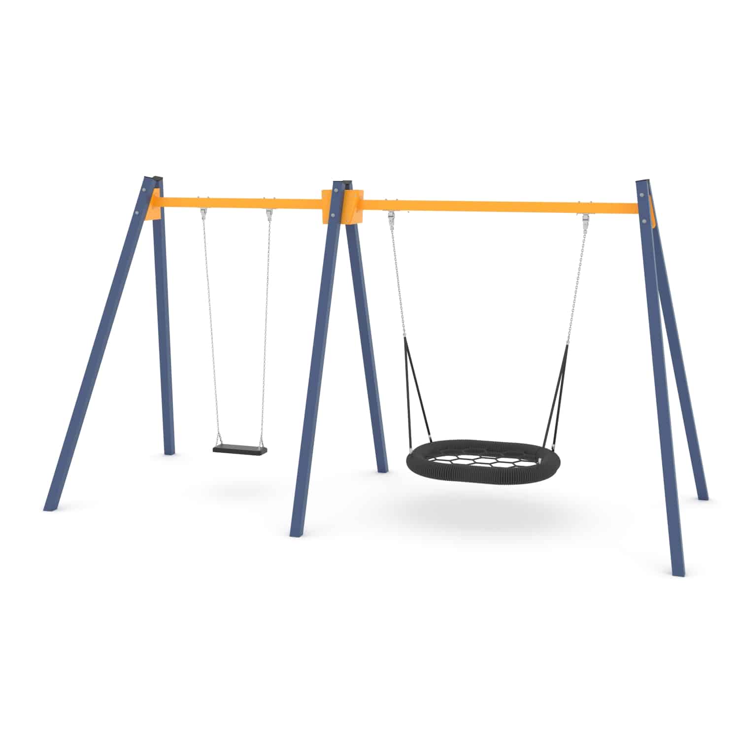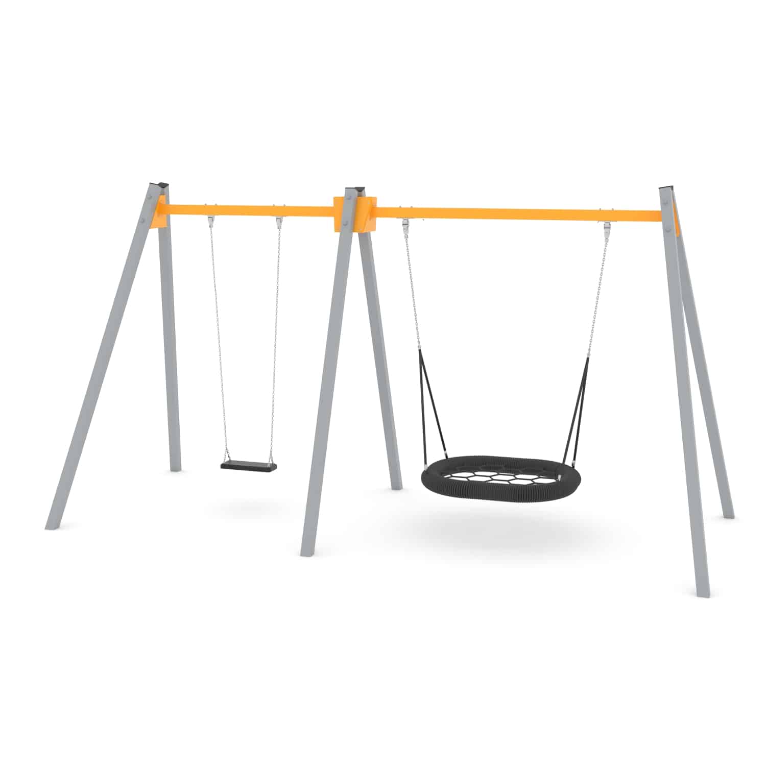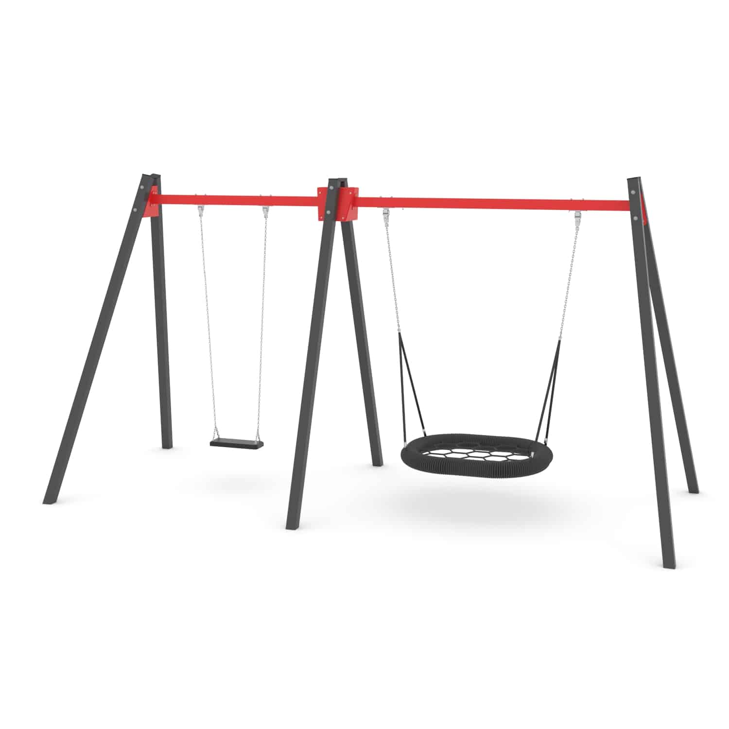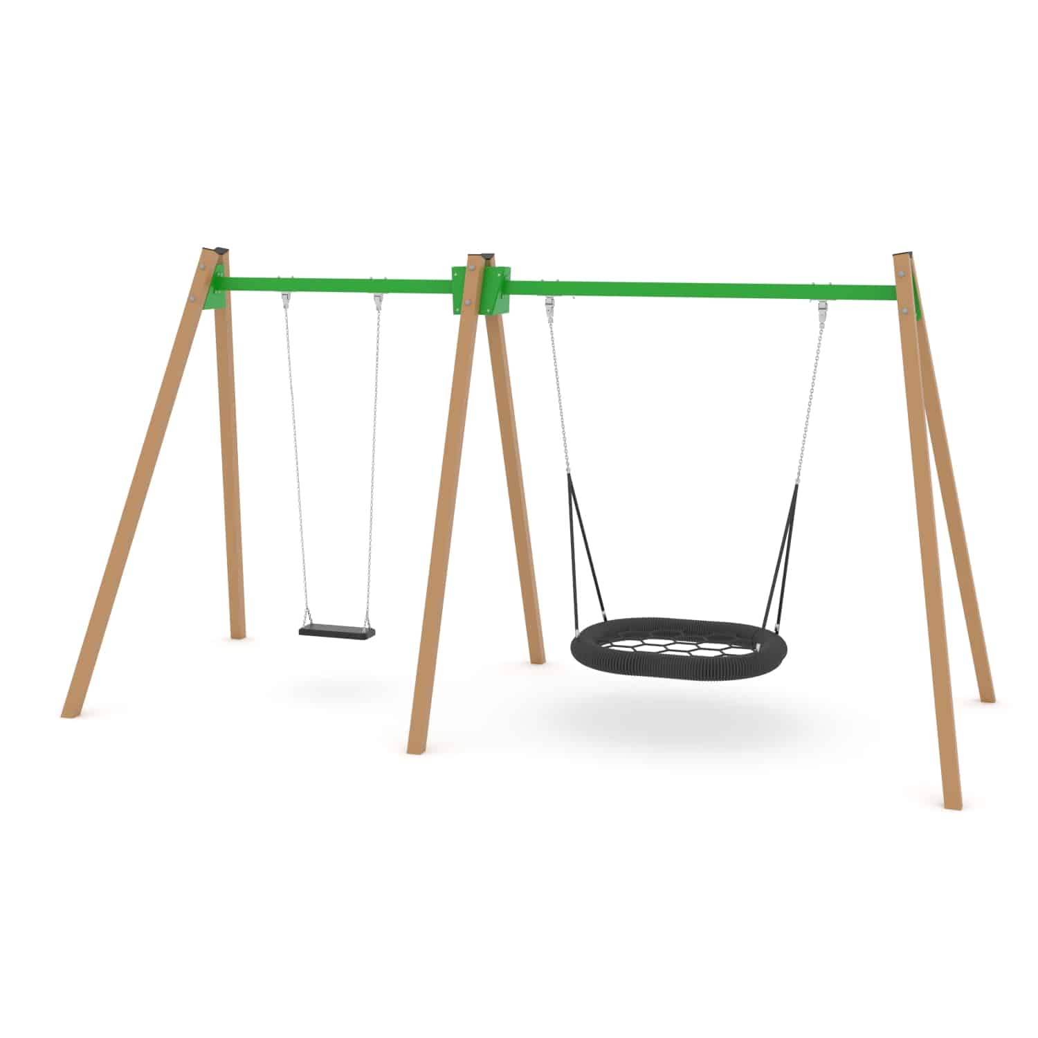 Strak vormgegeven Schommelcombi met een vogelnestschommel en standaard zitje waarbij optioneel voor een ander zitje gekozen kan worden.
