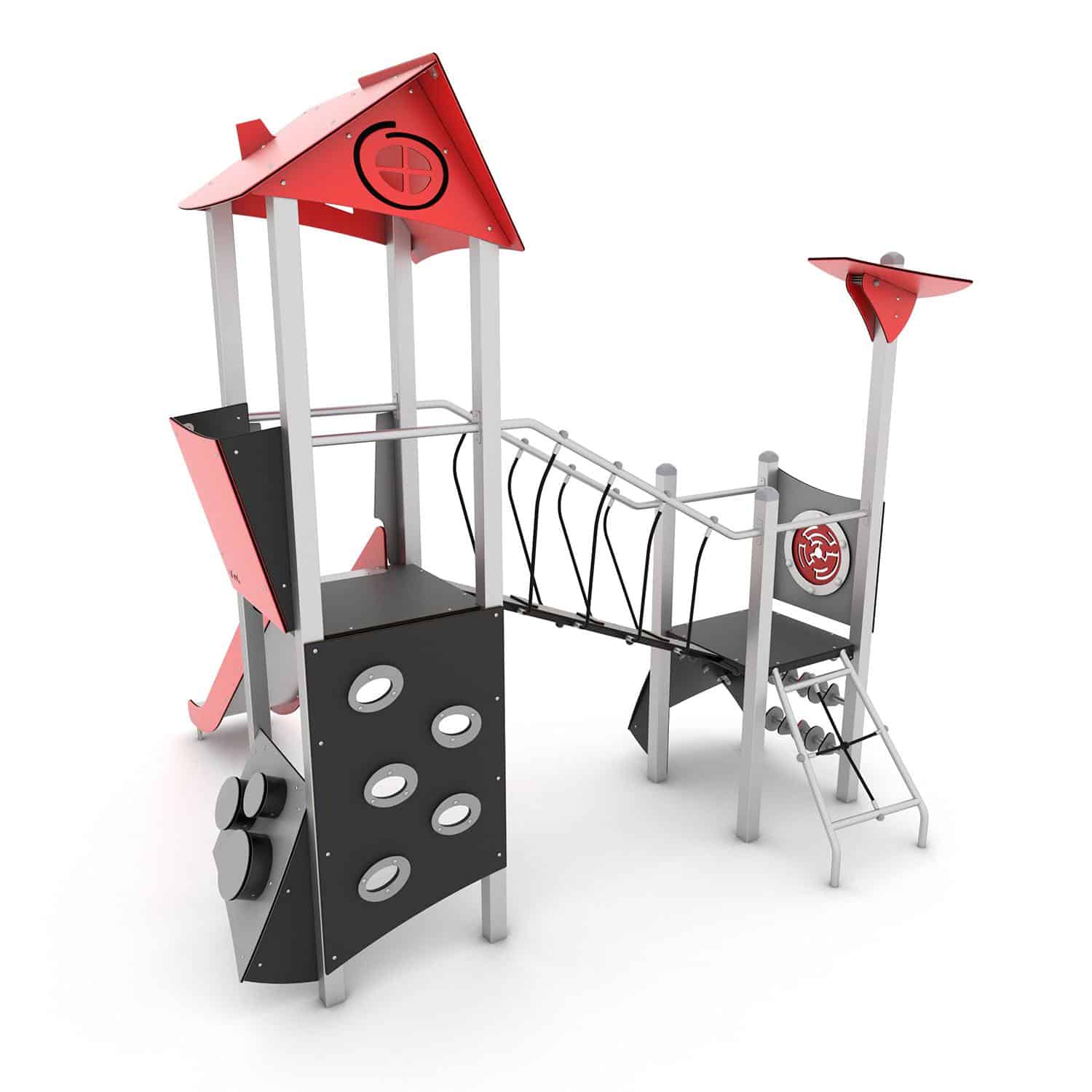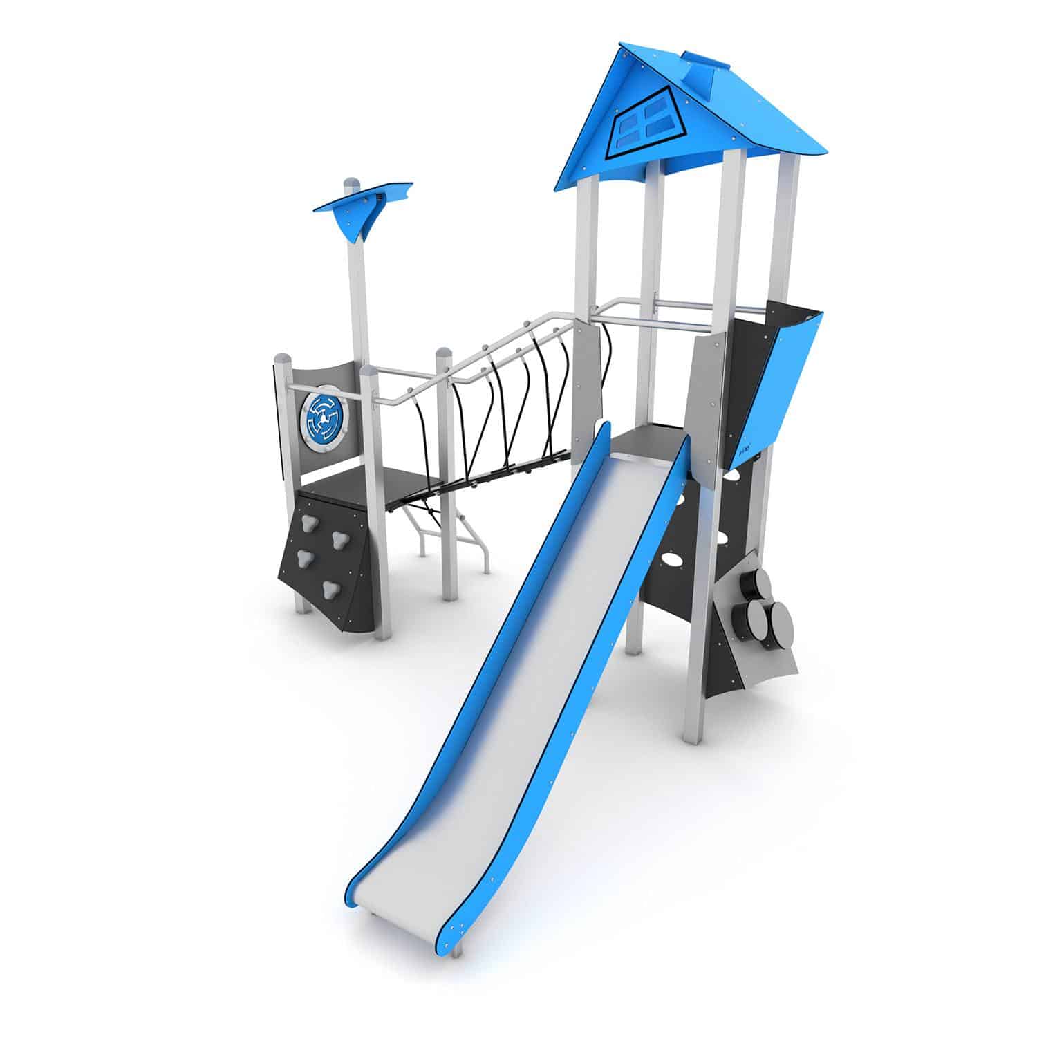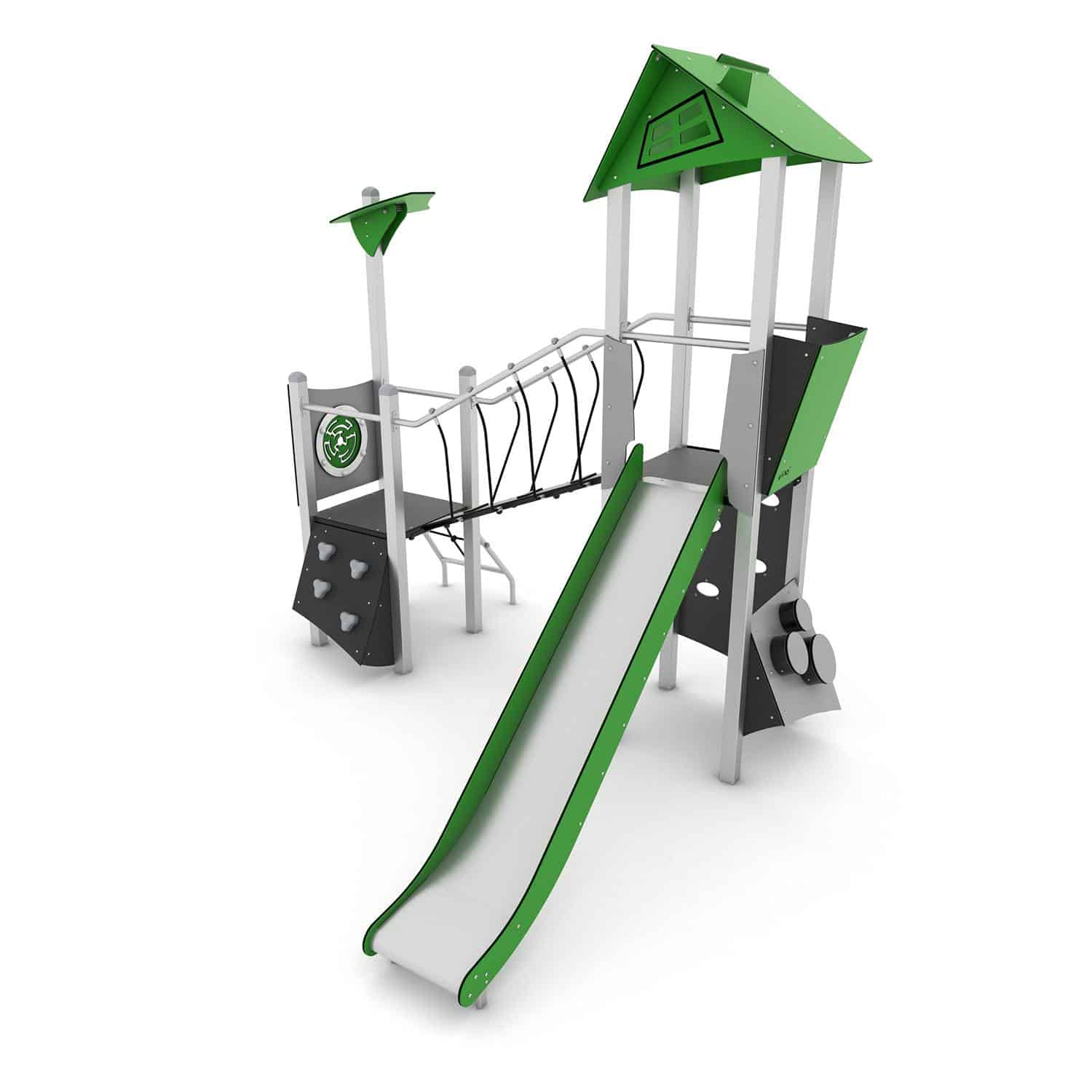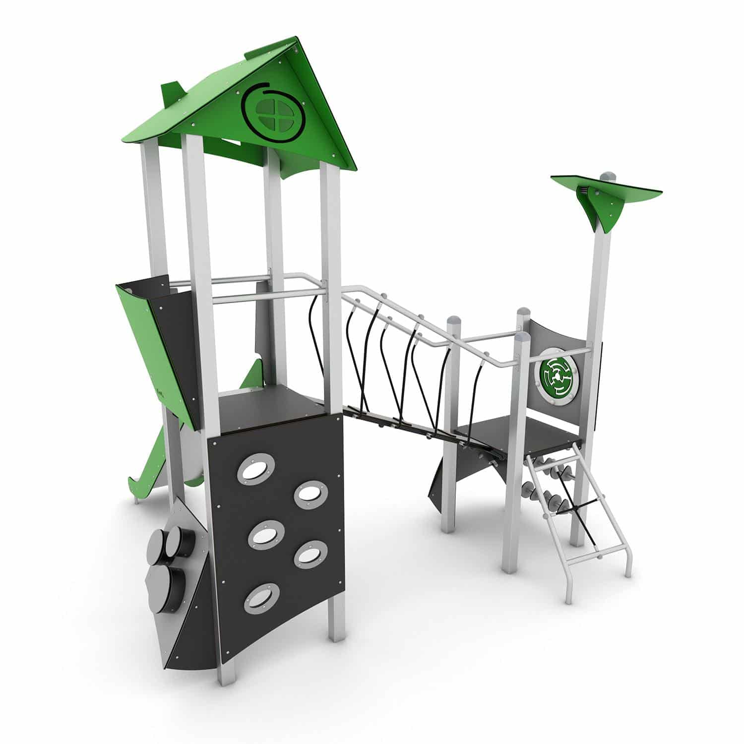 Speelcombinatie met 2 torens, klimwand, glijbaan en brug