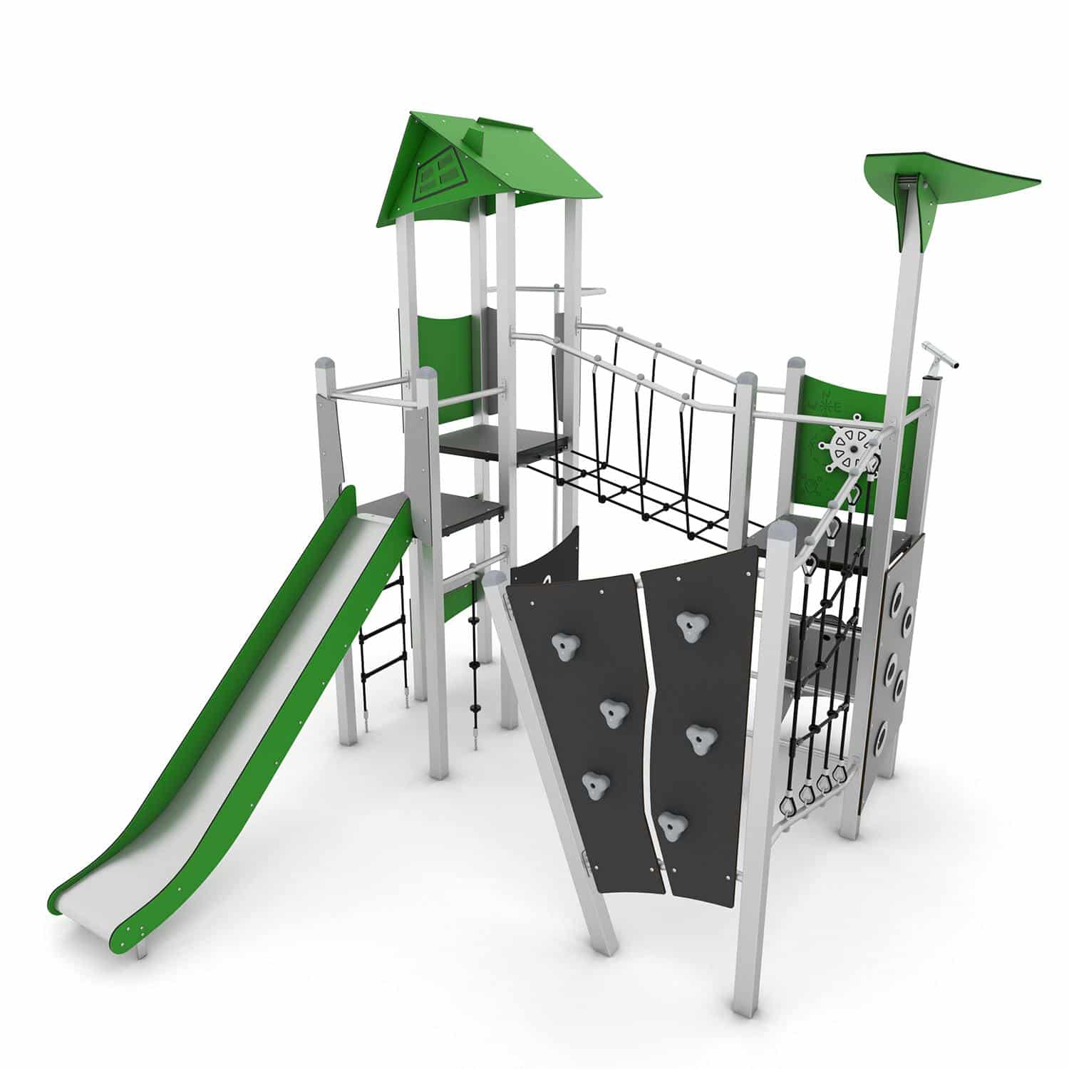 Speelcombinatie met klimwand, glijbaan, netbrug, klimnet en brandweerpaal