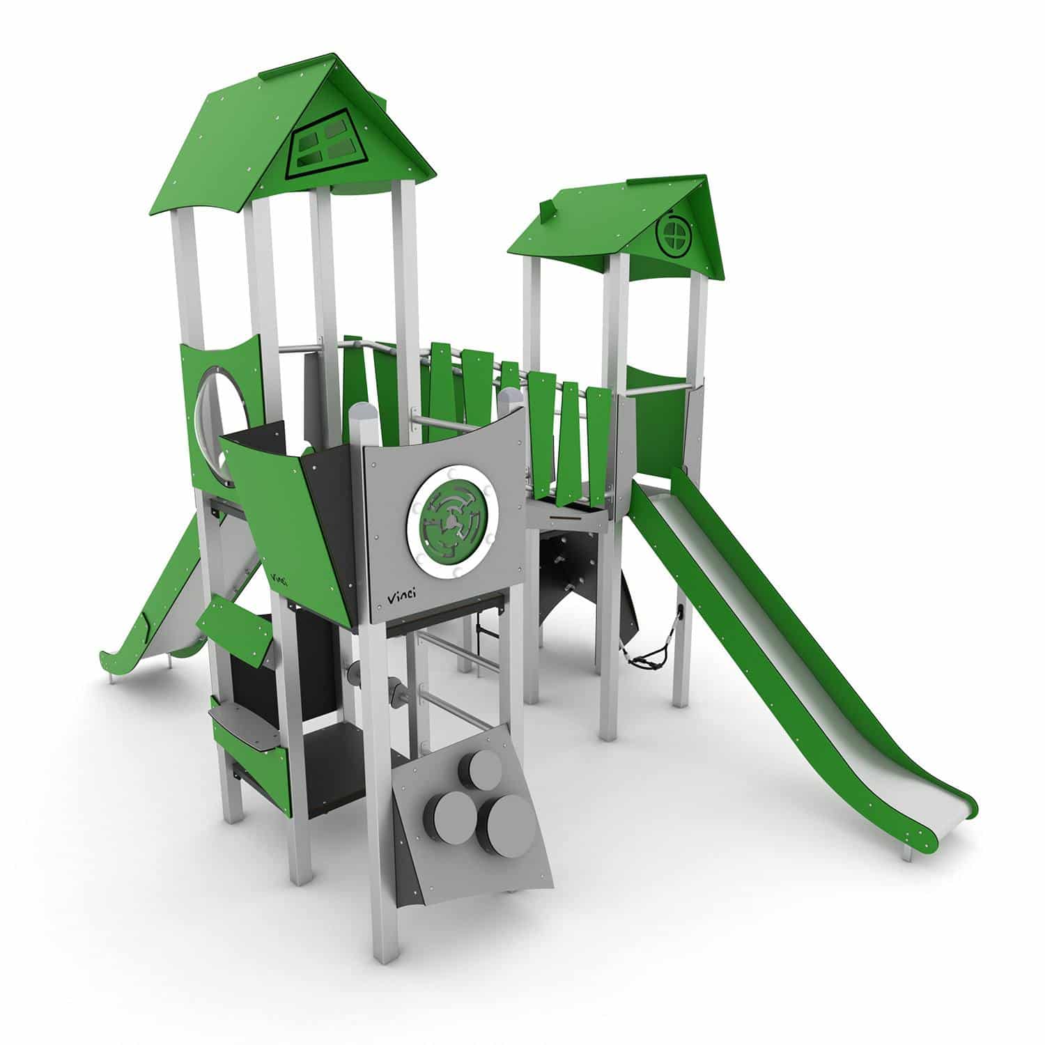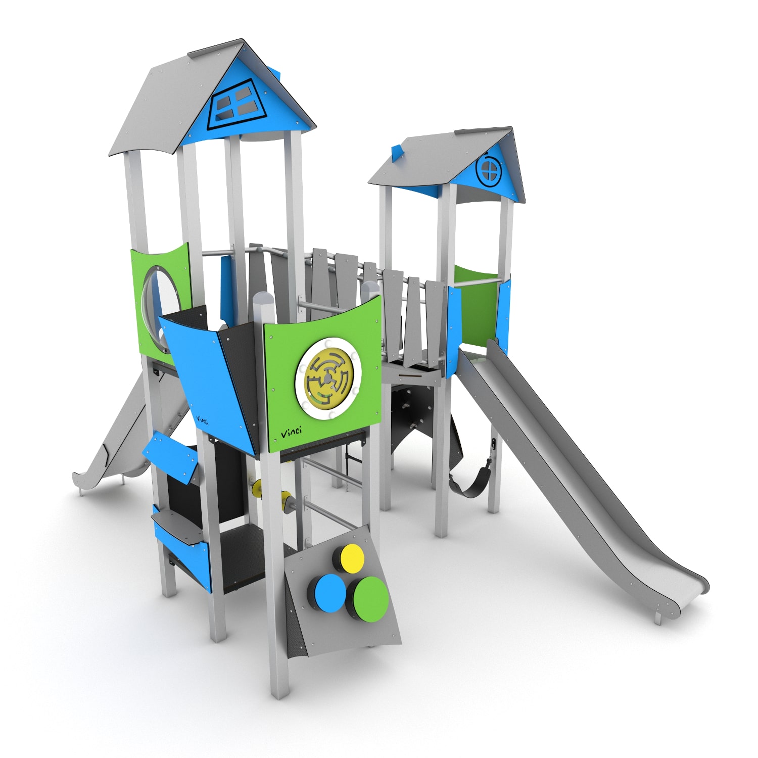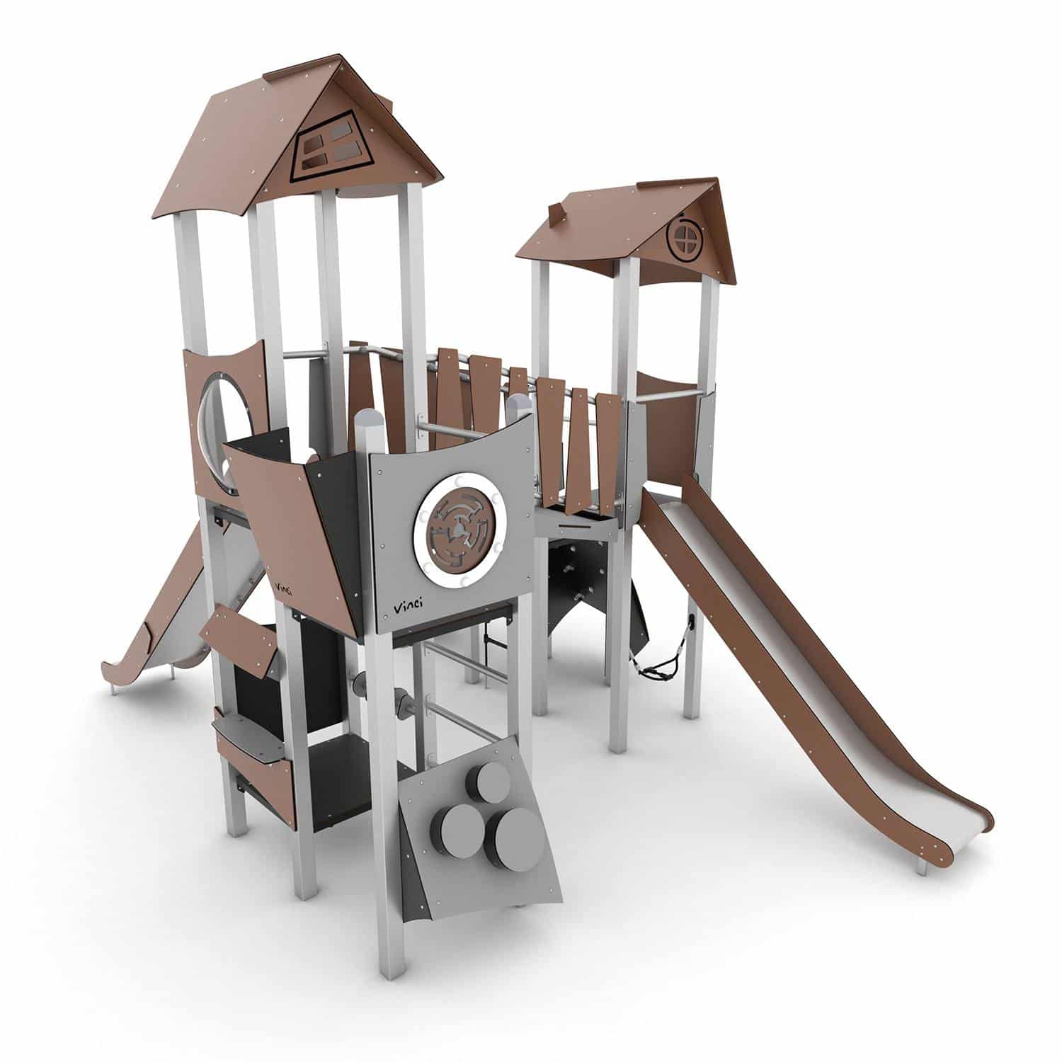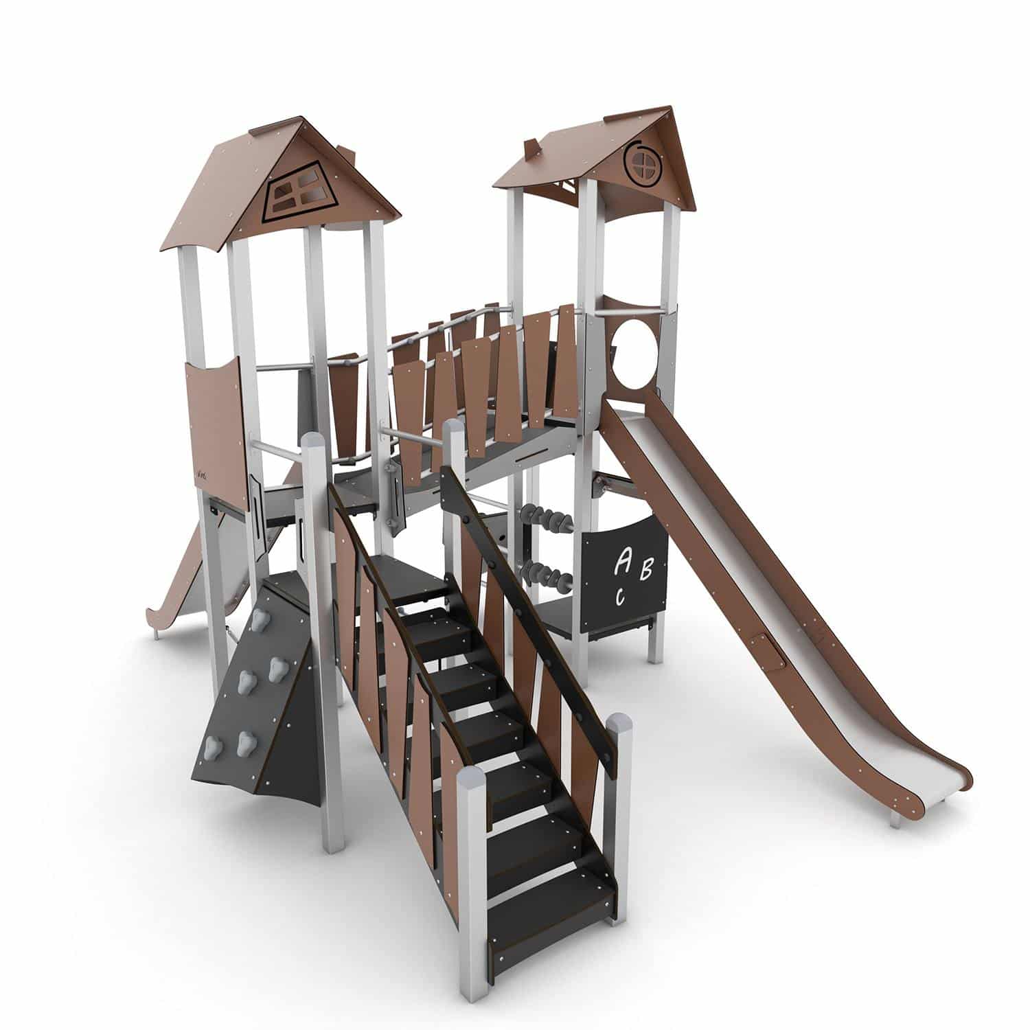 Speelcombinatie met 2 torens, trap, klimwand, brug en twee glijbanen