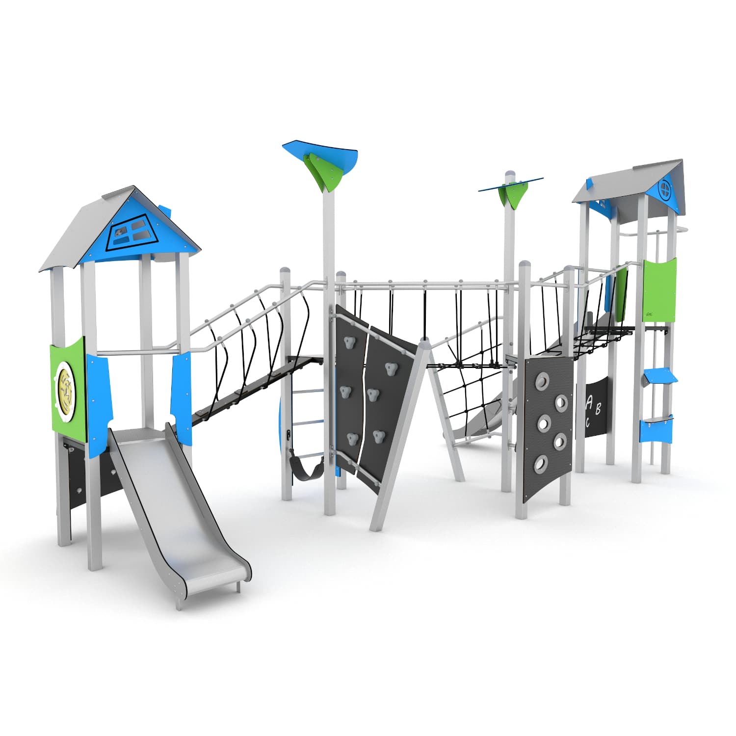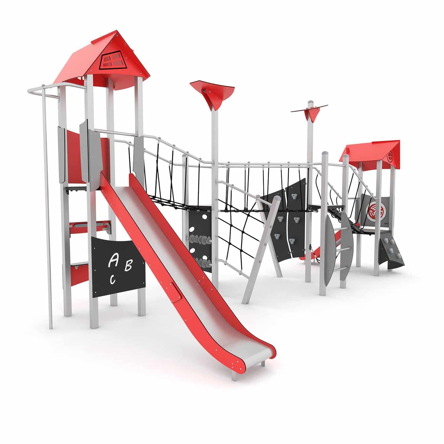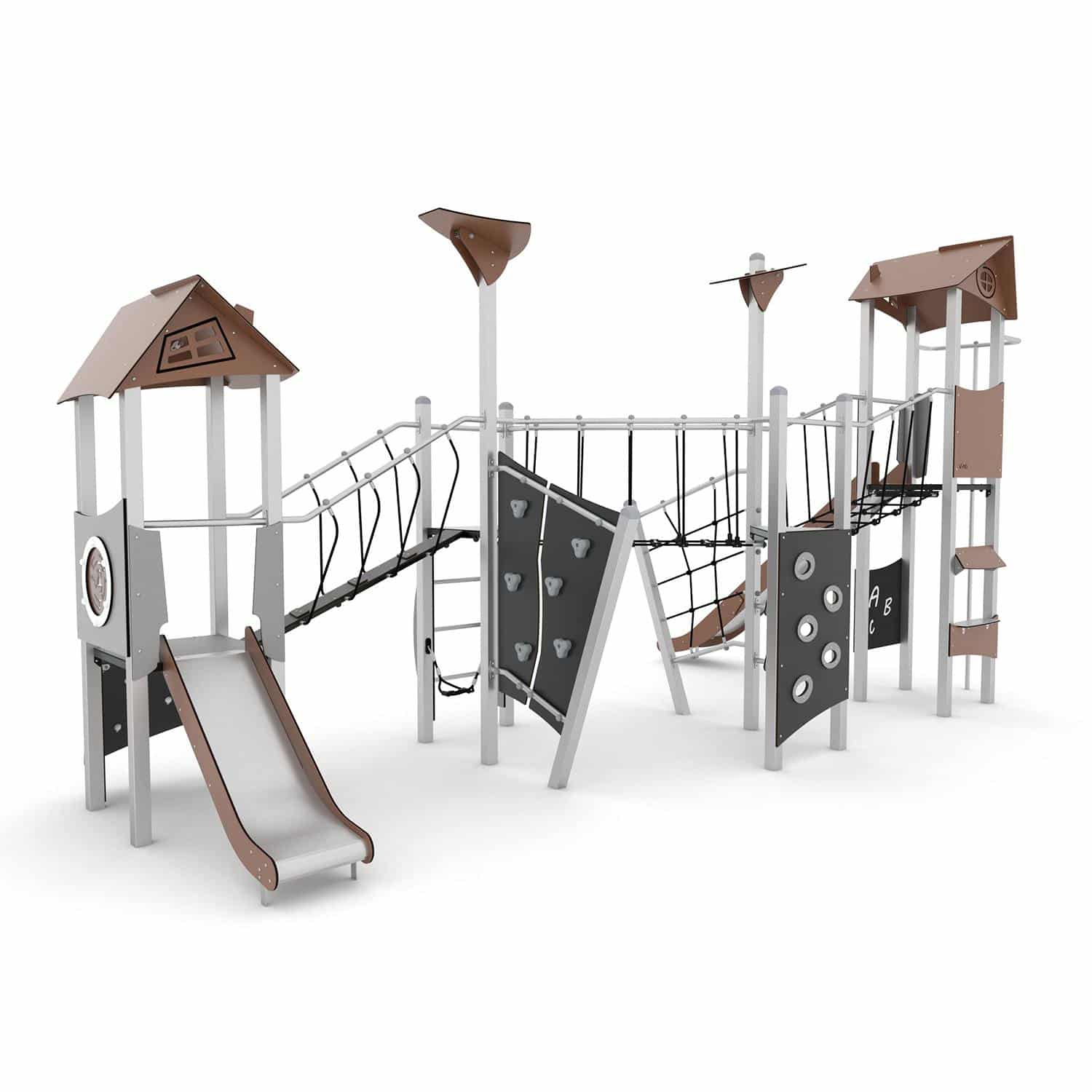 Speelcombinatie met 4 torens, bruggen, klimnetten, klimwanden, brandweerpaal en twee glijbanen