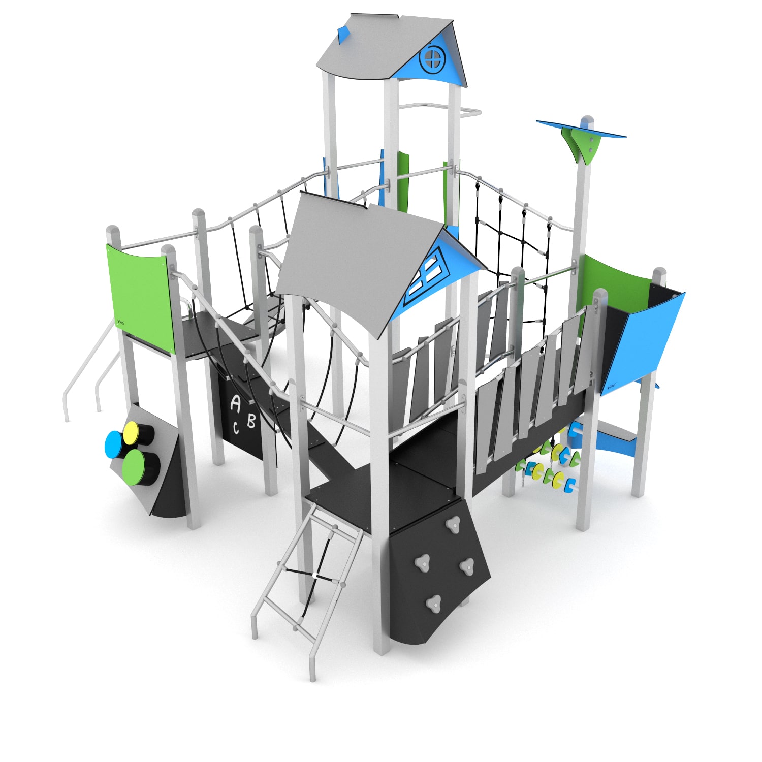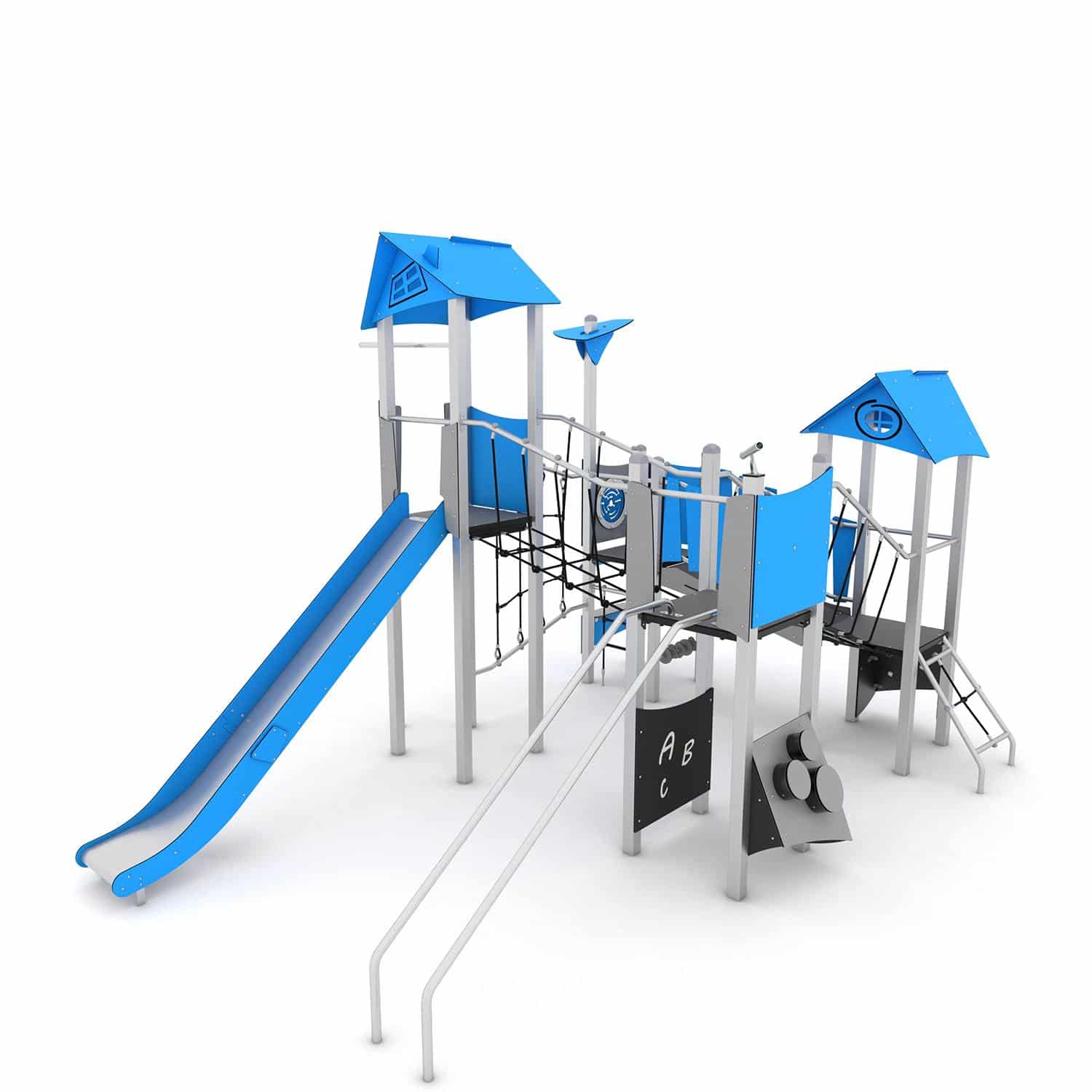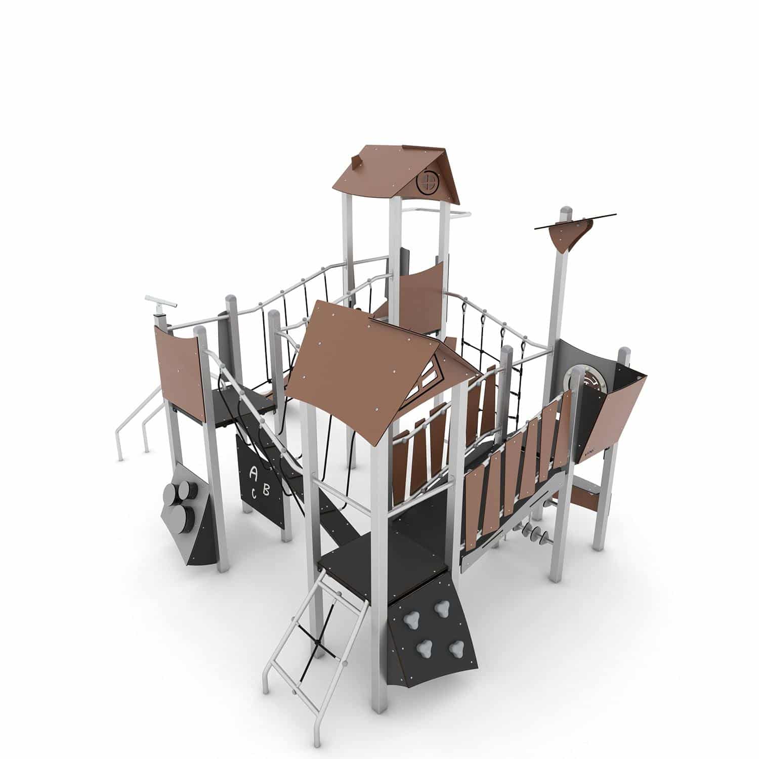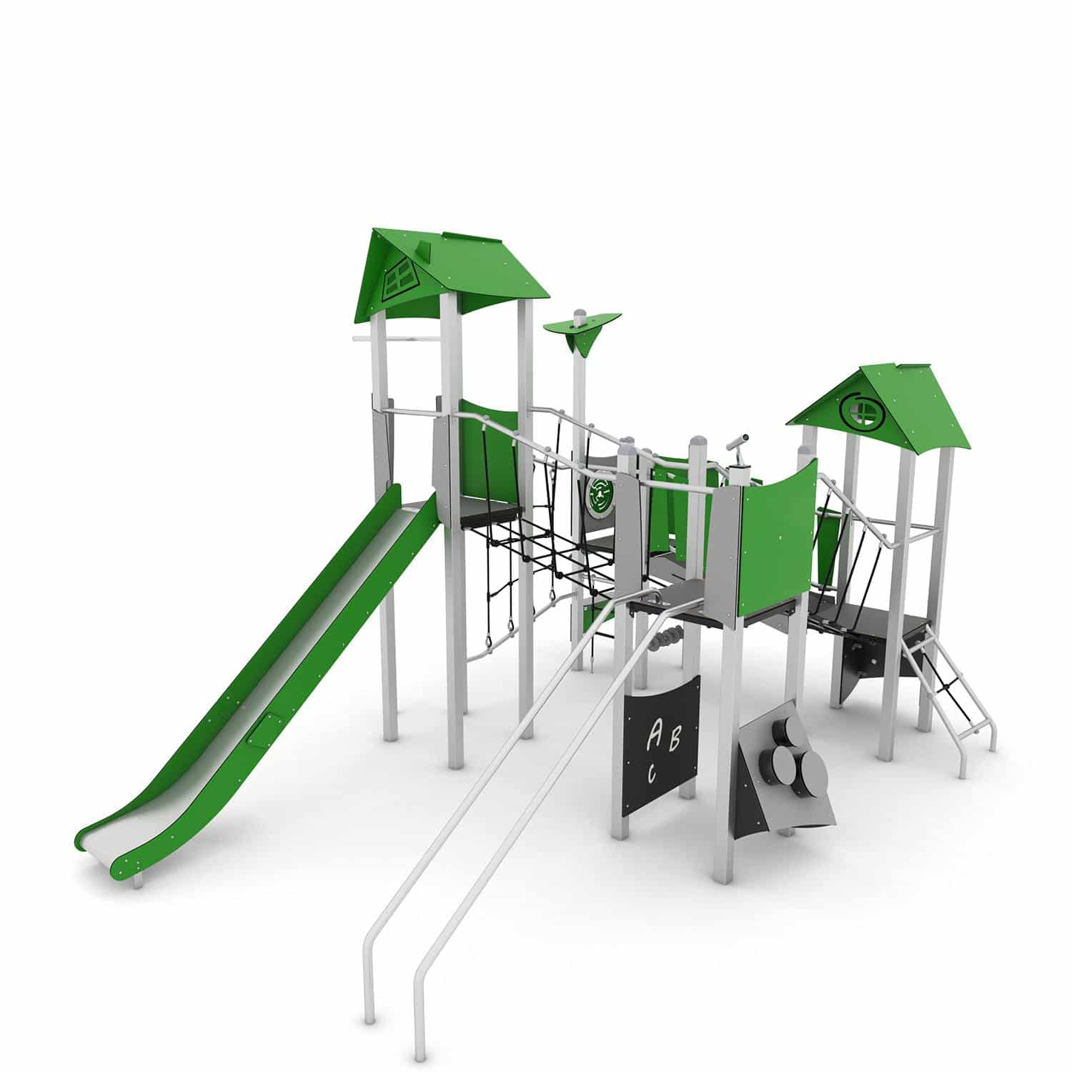 Speelcombinatie vierkant met 4 torens, bruggen, brandweerpaal, glijstangen en een glijbaan