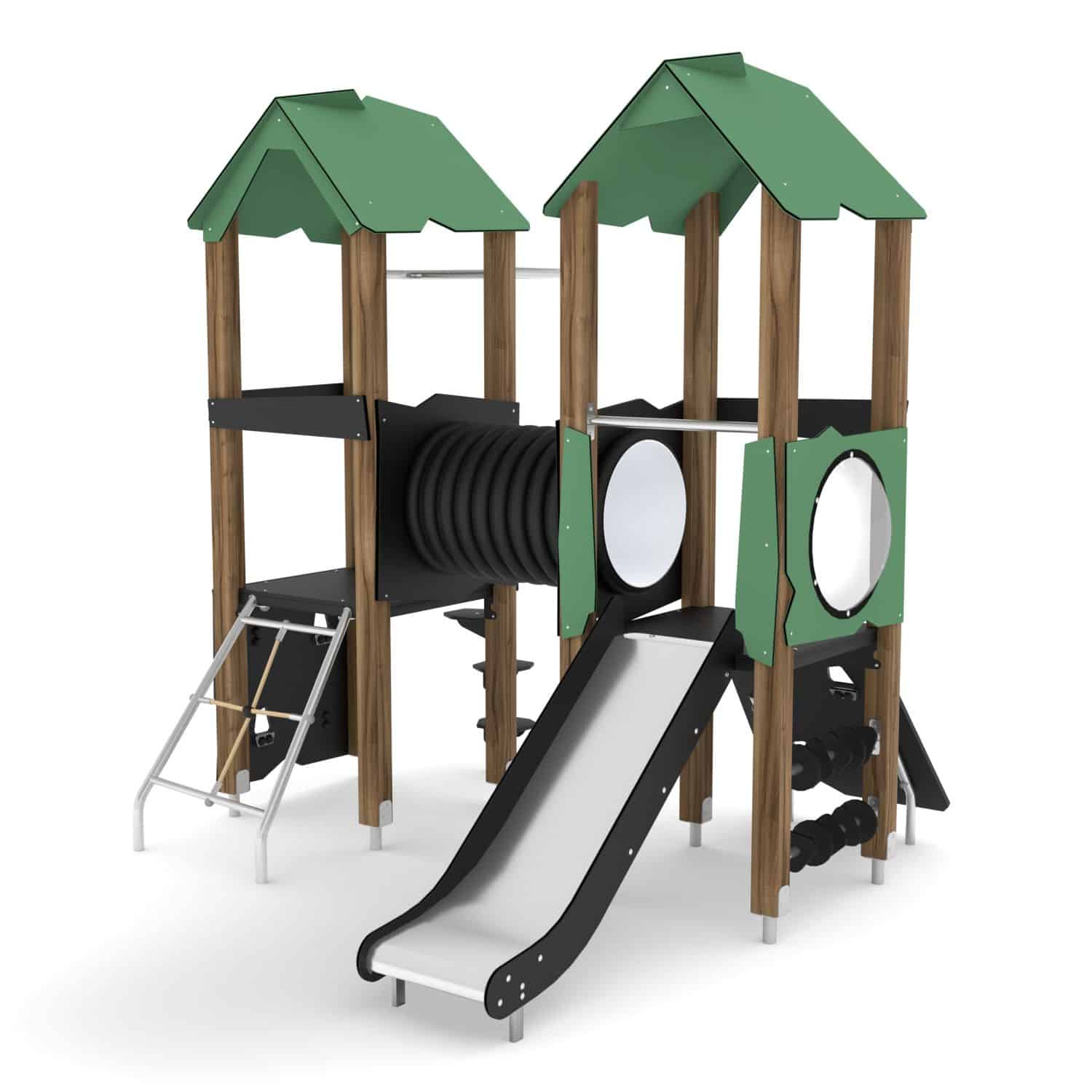 Speelcombinatie met 2 torens, glijbaan, kruipbuis en klim-/glijpaal