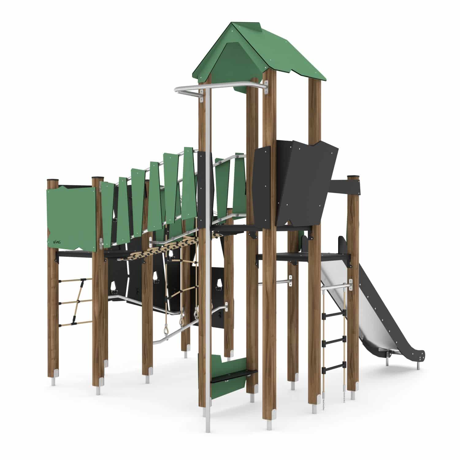 Door de WoodenSeries optioneel uit te rusten met bv groene HPL panelen i.p.v. de standaard HPDE panelen, passen deze toestellen ook zeer goed in de z.g. natuurlijke speeltuinen.