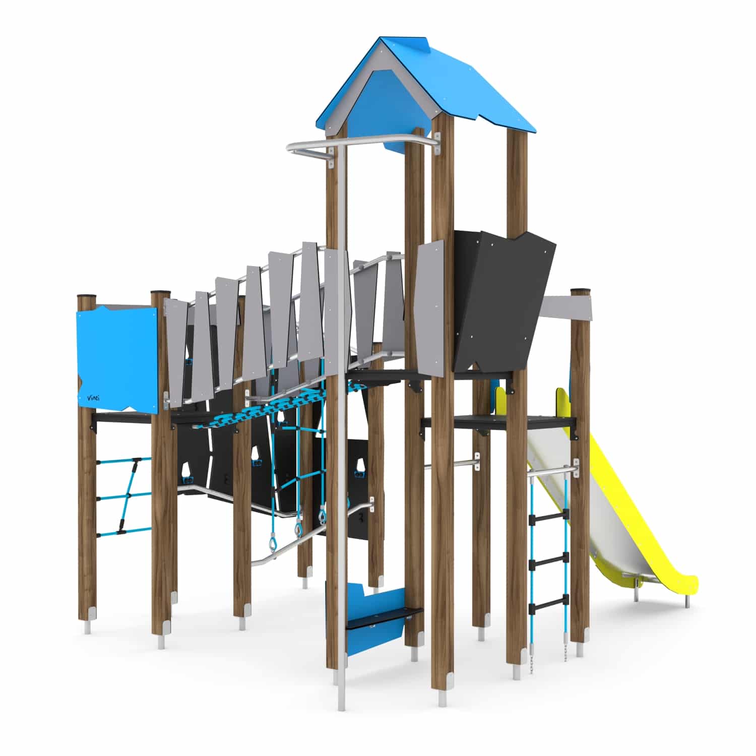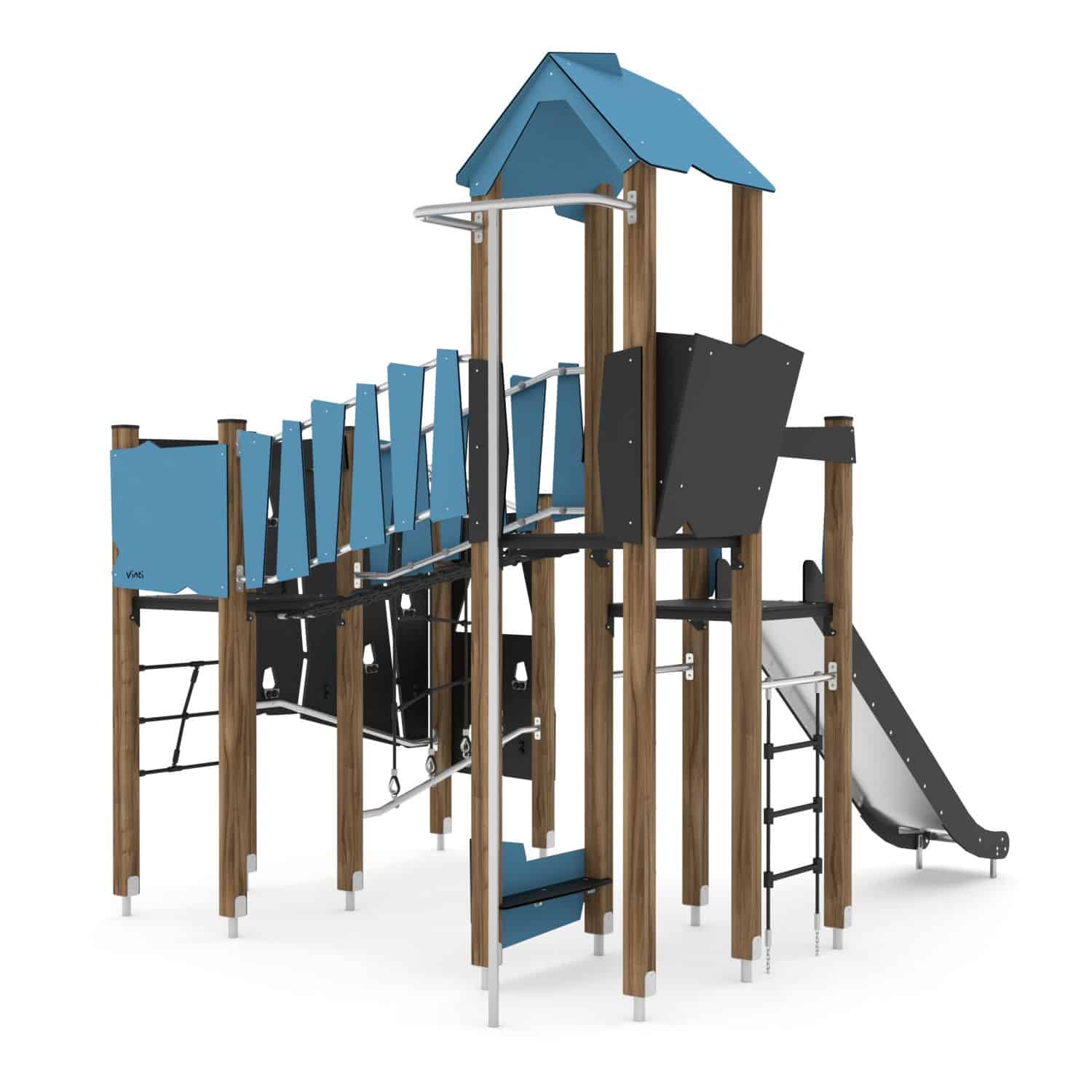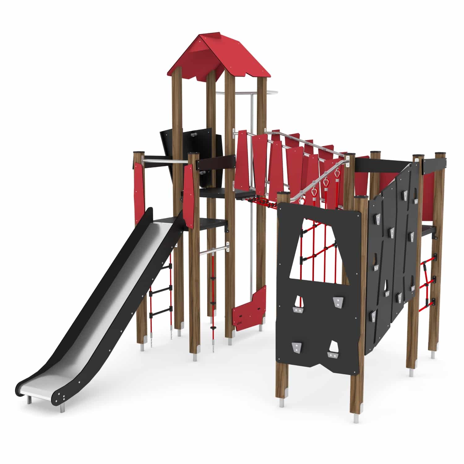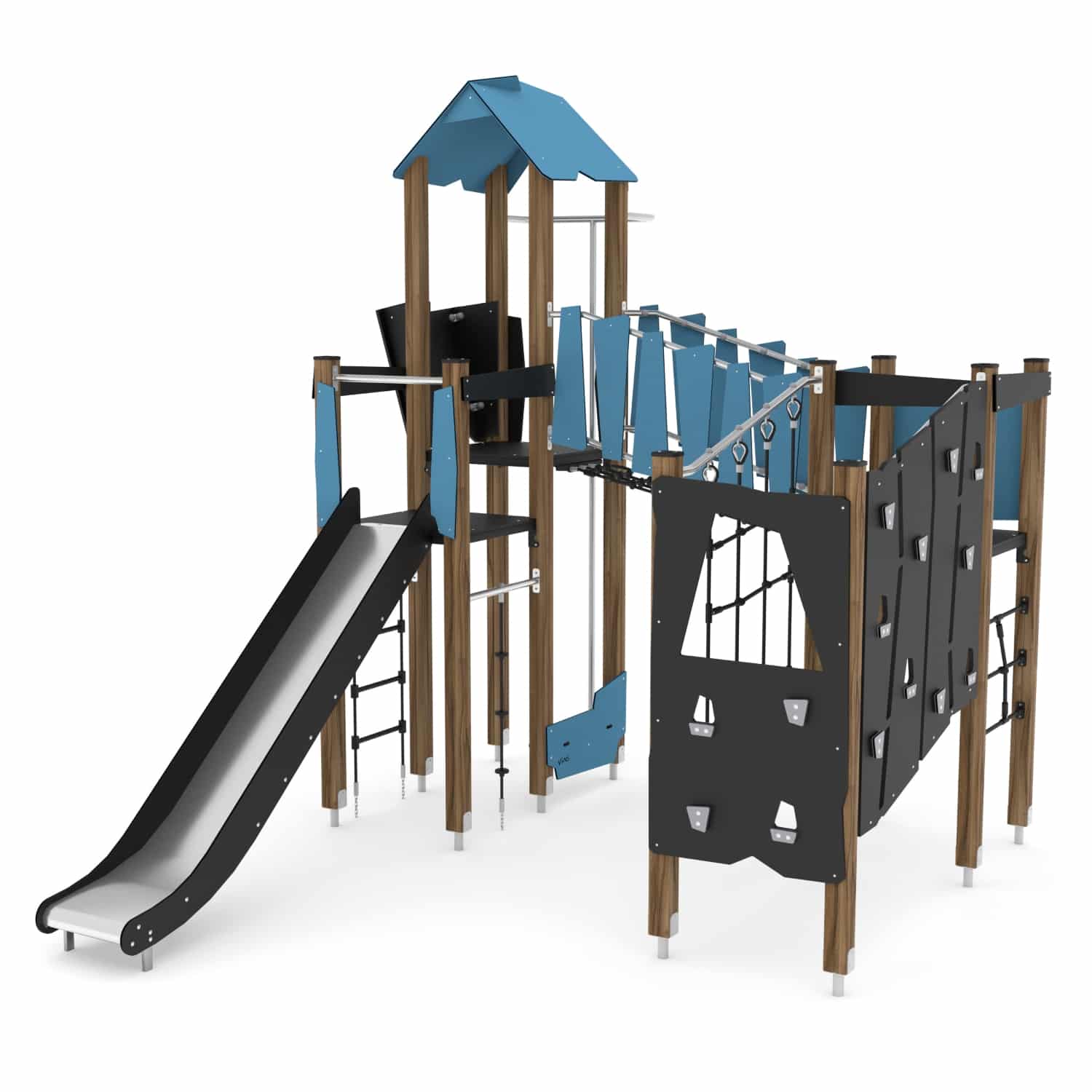 Speelcombinatie met netbrug, glijbaan, brandweerpaal, klimnet en -wand