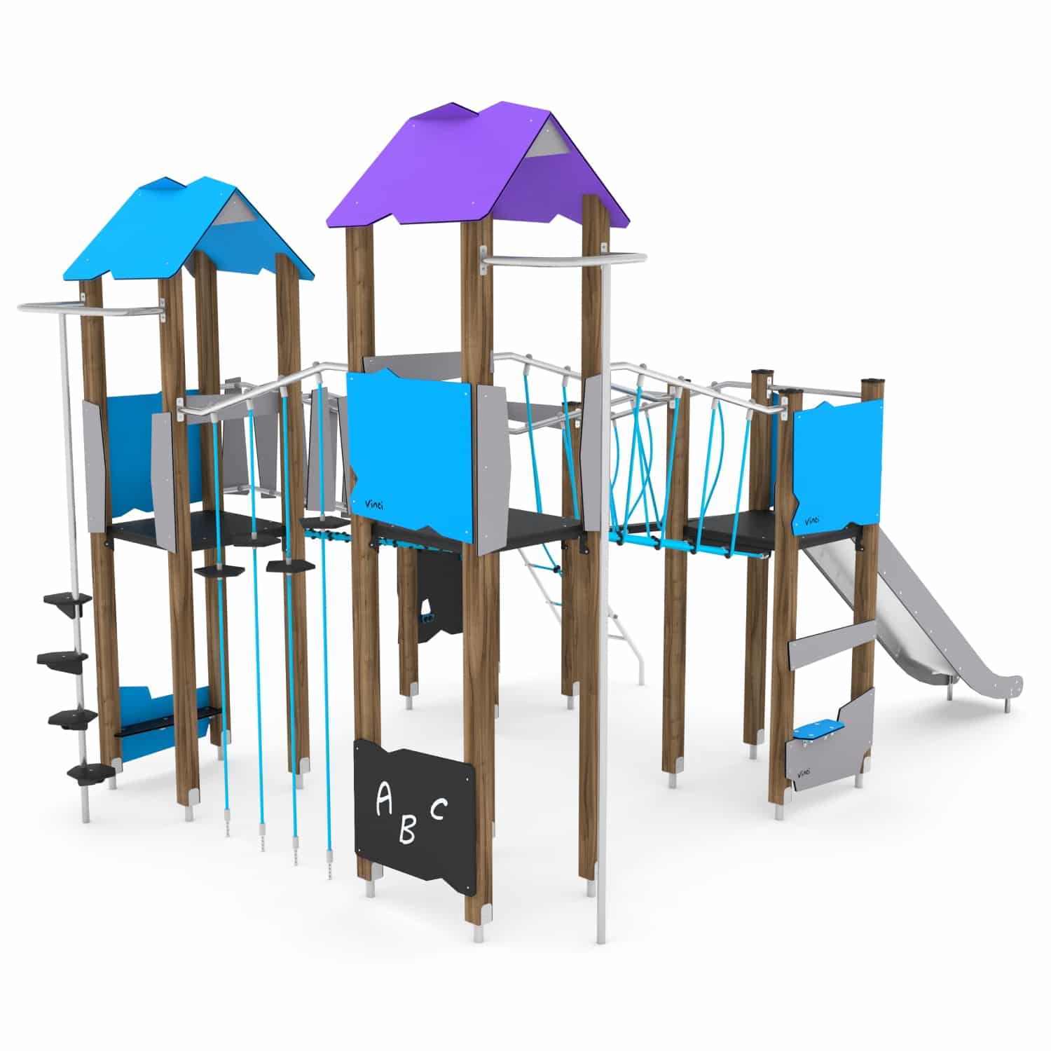 Speelcombinatie met 4 torens, bruggen, klimnet, glijbaan, klim-/glijpaal en brandweerpaa