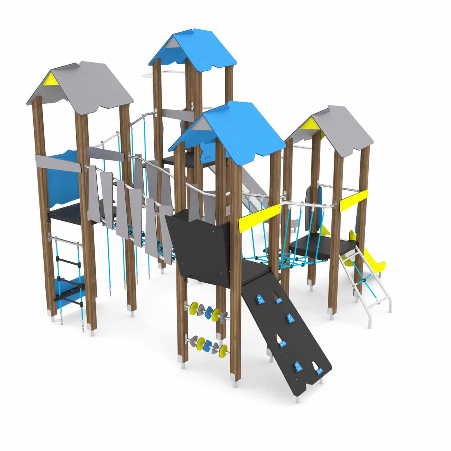 Speelcombinatie met 4 torens, bruggen, klimnet, klim-/glijpaal, brandweerpaal, hoge en lage glijbaan
