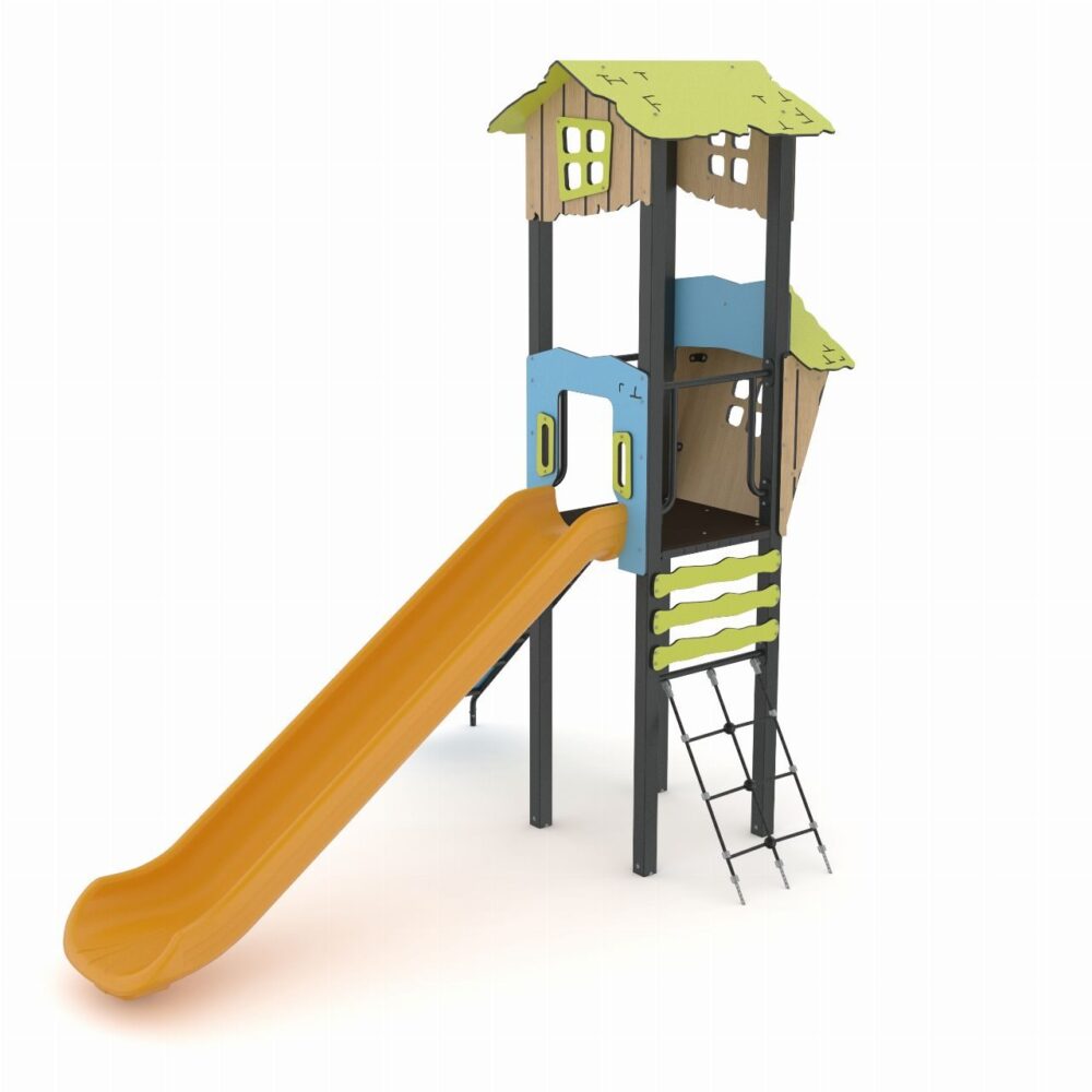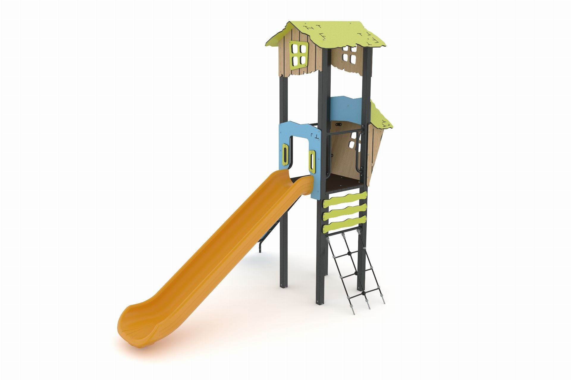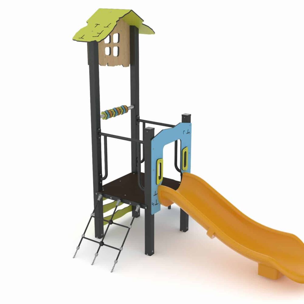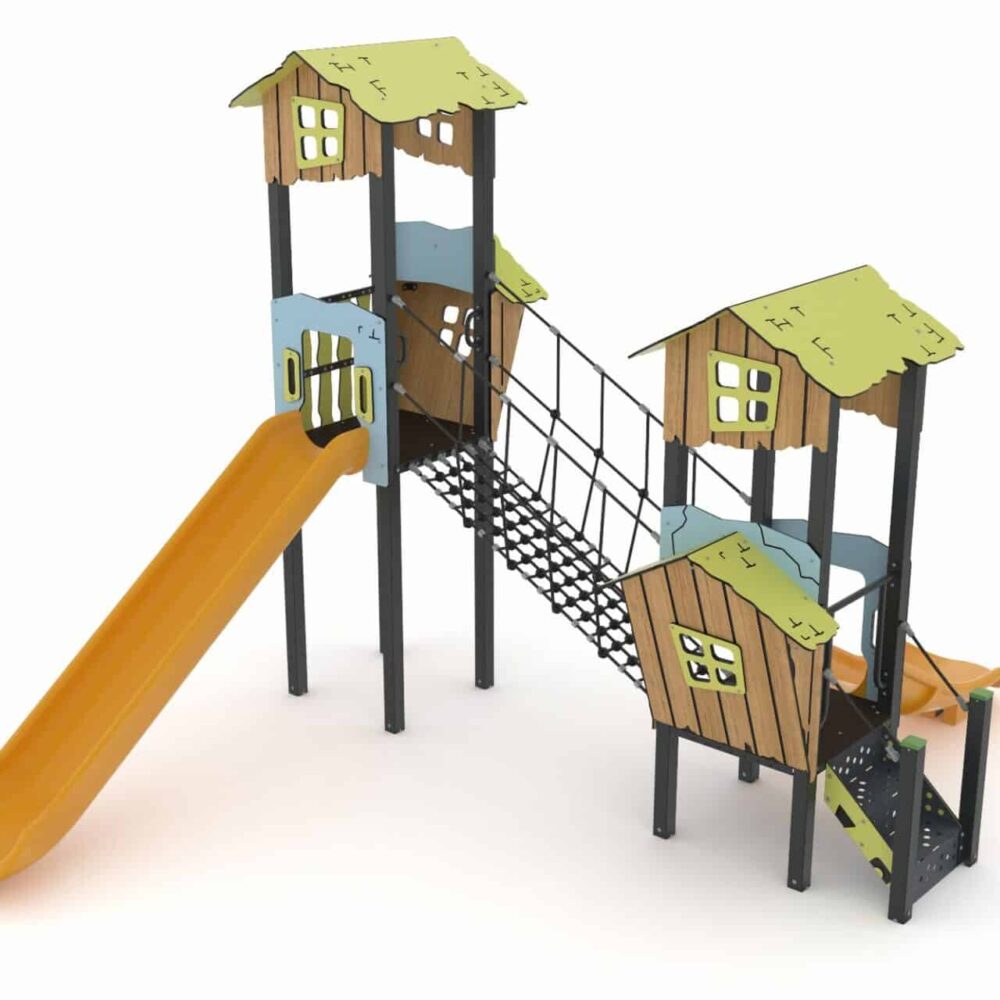 Speelcombinatie met klimnet, trapopgang, brandweerpaal en glijstangen