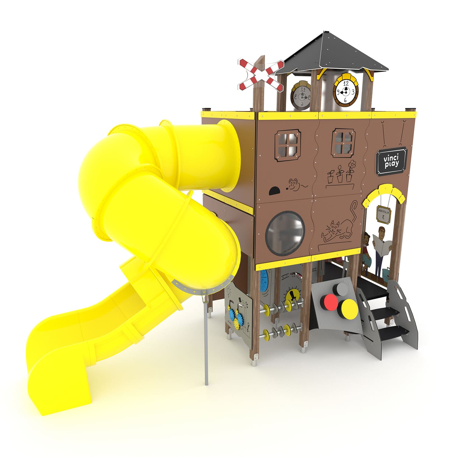 Multilevel Treinstation voorzien van veel grafische afbeeldingen en speelmogelijkheden. Buisglijbaan . Klim helemaal naar boven en kijk ver over de speeltuin heen.